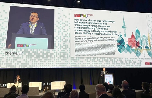 10月21日,EVO医药创新药卡瑞利珠单抗(艾瑞卡®)的一项研究“新辅助短程放疗序贯卡瑞利珠单抗联合化疗对比长程放化疗序贯化疗治疗局部晚期直肠癌”随机对照Ⅲ期试验(UNION) 以优选口头报告的形式正式亮相。该研究由华中科技大学同济医学院附属协和医院张涛教授、陶凯雄教授担任主要研究者,华中科技大学同济医学院附属协和医院林振宇教授在马德里现场报告了该重磅研究的结果1,此项研究是全球首个评估短程放疗序贯免疫治疗联合化疗治疗局部晚期直肠癌的Ⅲ期研究,已达到主要终点病理完全缓解(pCR),有望为直肠癌患者的治疗提供新策略。